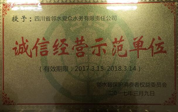 鄰水愛眾水務公司榮獲“鄰水縣誠信經營示范單位”稱號